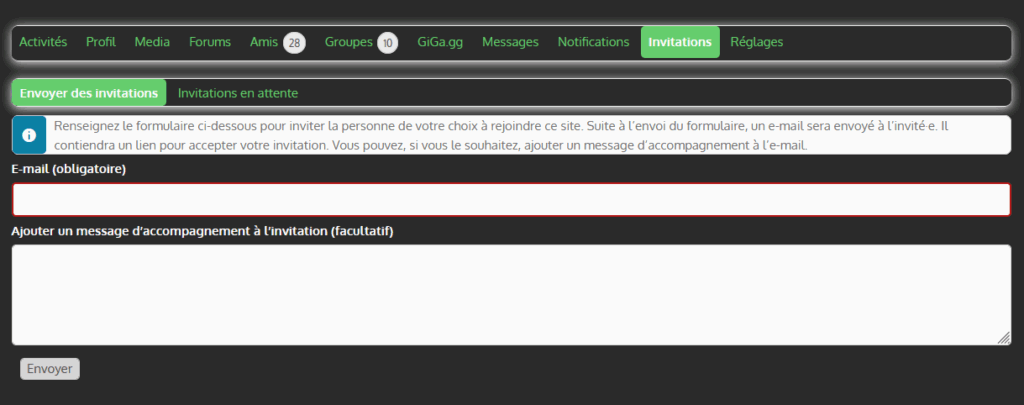 Chaque utilisateur inscrit pourra invité un amis sur le site via la page invitation de leur profil.
